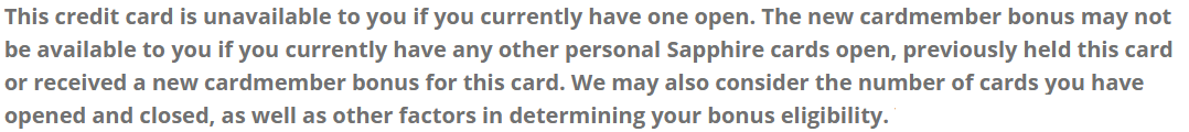 You may be ineligible to earn a signup bonus on a Sapphire card if you currently have a Sapphire personal card open, previously held the same card, or received a new cardmember bonus for the same card
